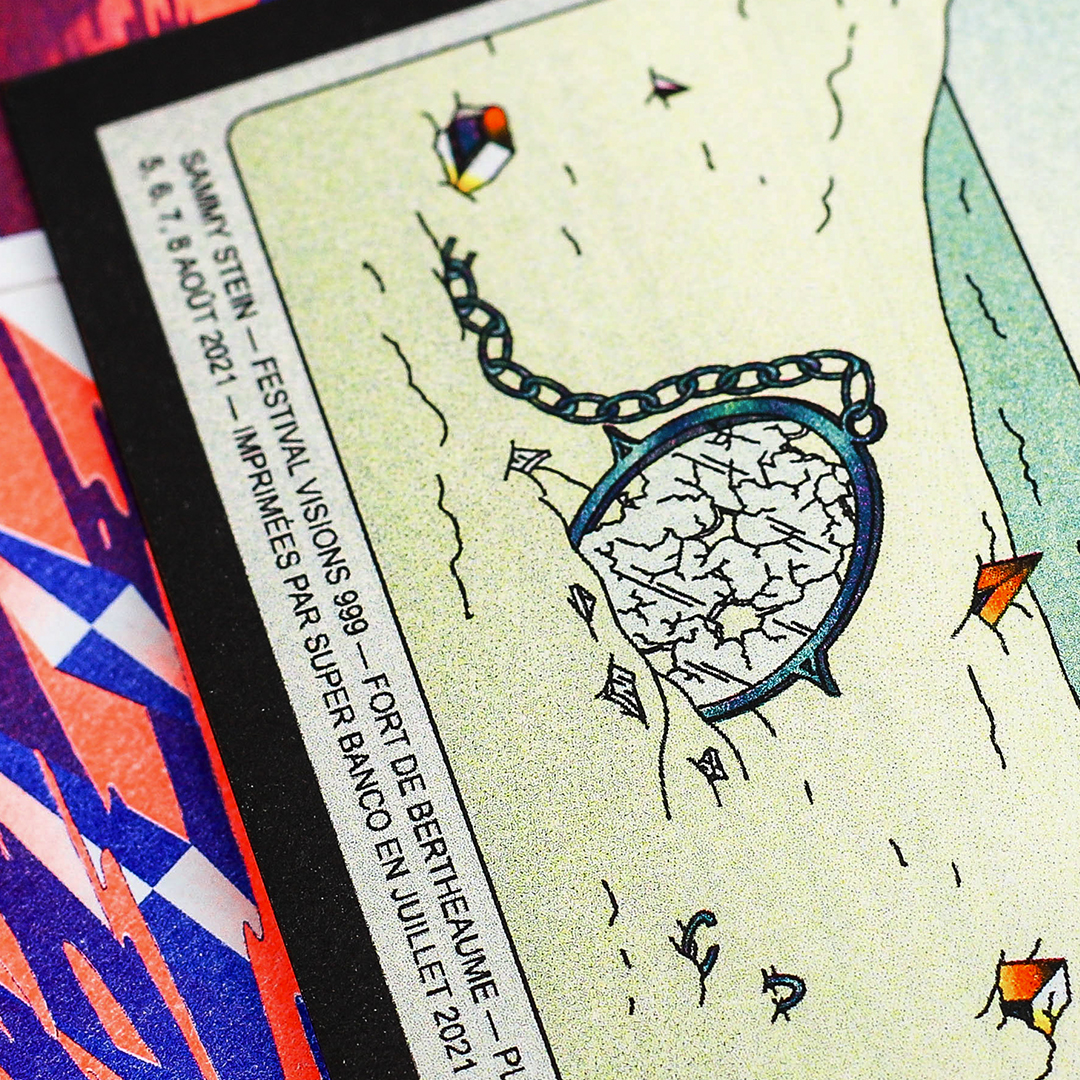 Les organisateurs ne voulaient pas produire une énième affiche de festival mais essayer de trouver une autre manière de faire vivre les visuels qu’ils m’avaient commandé. Ils m’ont proposé de faire un zine, sans aucune contrainte, qui ne serait pas le programme, qui ne contiendrait pas le nom des groupes. Aussi, je me suis tout de suite dit que je voulais faire une fiction qui serait l’opposé de l’ambiance d’un tel évènement. Je voulais plutôt évoquer la solitude, le silence. Je me suis concentré sur le lieu du festival ( auquel j’avais déjà assisté quelques années auparavant ) qui est exceptionnel. Il y a derrière la scène, l’océan avec une petite île et son fort. C’est le point